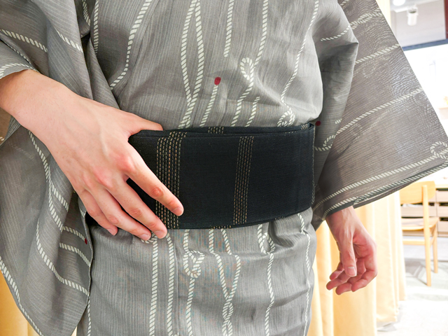 帯はシックに、黒の麻素材をチョイス。キュッと引き締まった印象を与え、大人の格好良さが引き立ちます。