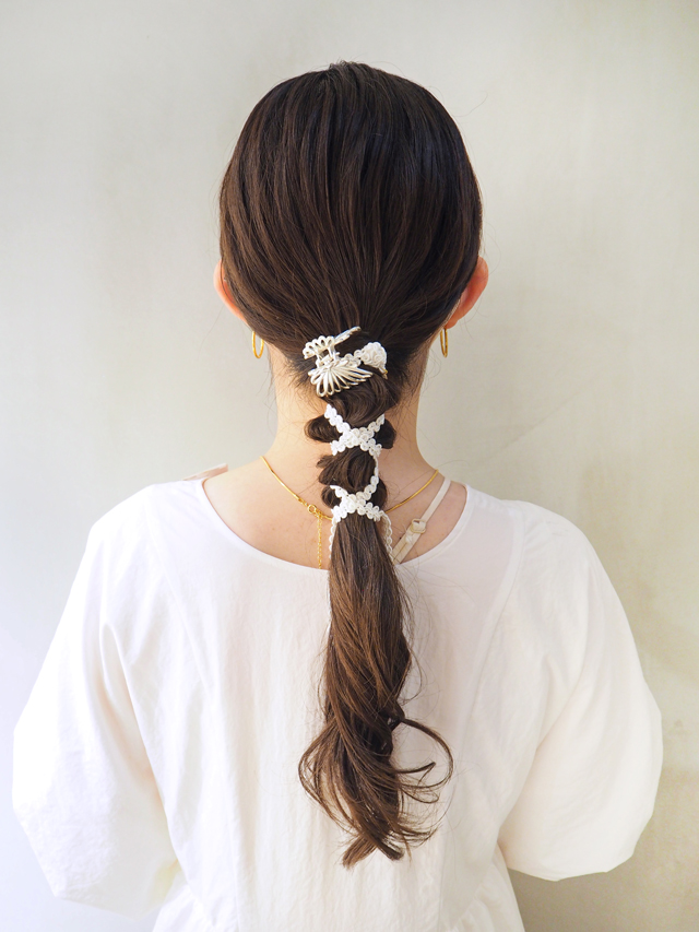 作ったリボンを隠すように手先を折り返し、真ん中をつまんでヘアゴムで留めます。