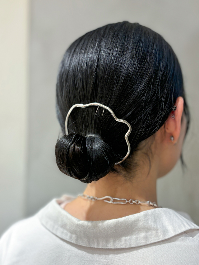 低い位置でまとめ、結び目を髪の毛でくるっと巻き上げてメタルフラワーバンスをオン。ほどよく後れ毛を出すとこなれた雰囲気に♪