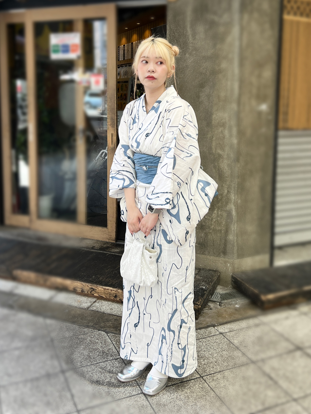 「波の綾」と名付けられたこちらの浴衣。水面がそのままデザインされたような涼しげな雰囲気が、夏を爽やかに彩ります。ふわふわとした生地感で肌にはり付きにくく、軽やかに着られるのも魅力。