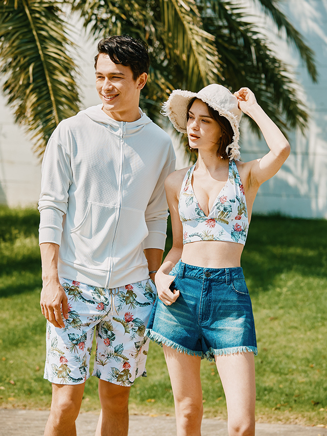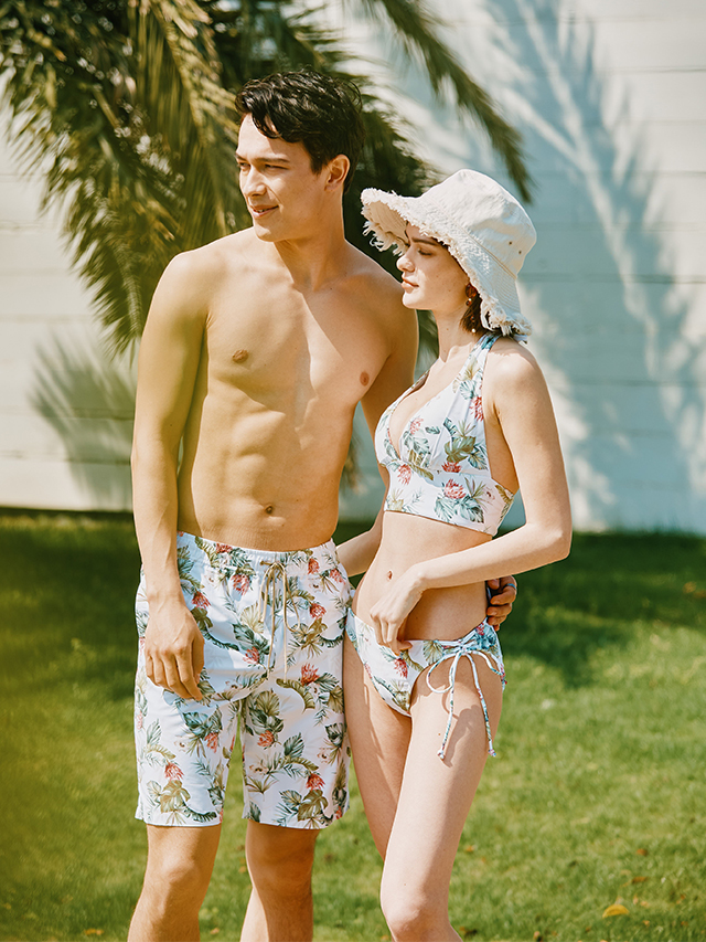 繊細なタッチとクールな印象のトロピカル柄なので、シンプルなウェアとのコーデが相性抜群。ビーチデニムやラッシュパーカーと合わせたトータルコーディネートもおすすめです。