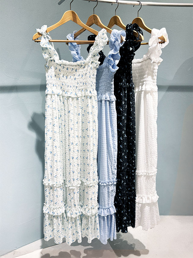 ロング丈のワンピースは裾のフリルが動くたびに揺れて華やかさを演出。オフショルで着こなすとフェミニンな印象をプラスできます。ウエストのシャーリングが高めなのでスタイルUP効果も♪