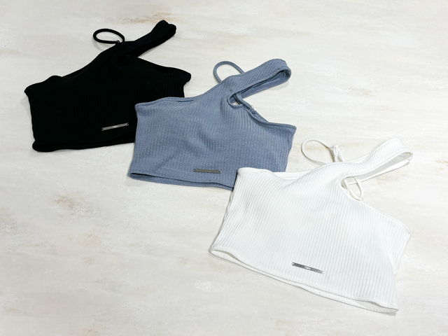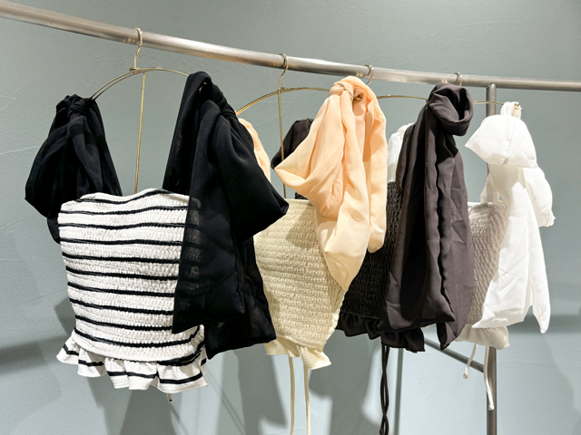フリルとギャザーが印象的なトップスもスタッフさんイチオシのアイテム。フリルを肩から落とすとオフショルダーとしても着られます。レースアップのショーツと合わせてスタイルの良さをアピールするのもおすすめ。