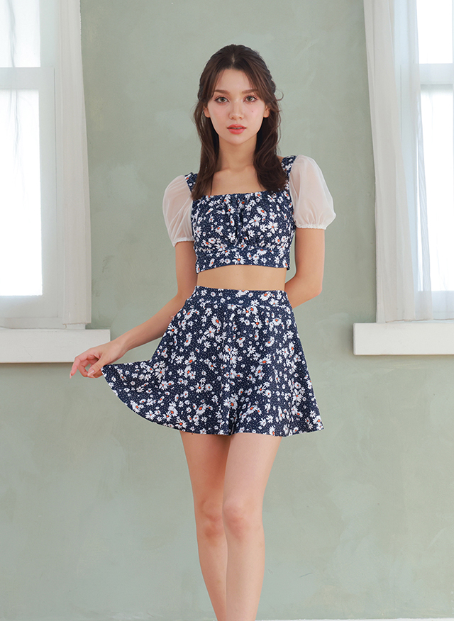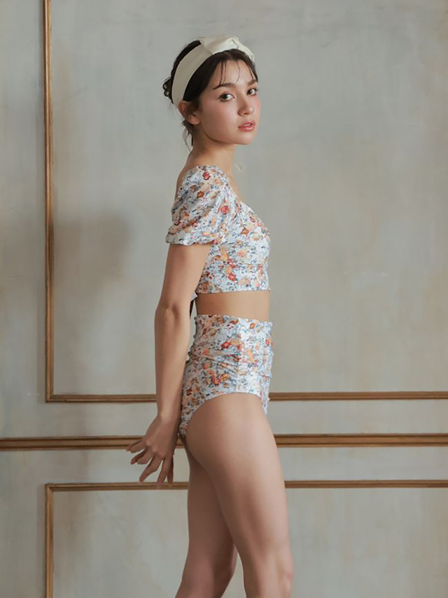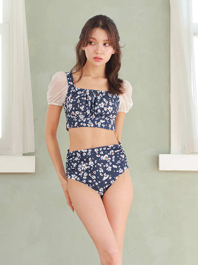 ちょっぴりレトロなマーガレット&ドット柄に、シアー素材のパフスリーブが今年トレンドの「コケットコア」を演出!可愛らしさもあって、色っぽさもある袖付きビキニです。背中のシアーリボンもポイントで、後ろ姿まで抜かりなく可愛いアイテム◎