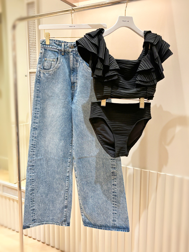 シルエットが可愛いワイドデニムにヒールサンダルを合わせれば夏のレジャーコーデが完成。水着のトップスは普段使いしやすいデザインなので、街へのお出かけ時にもぜひ♪