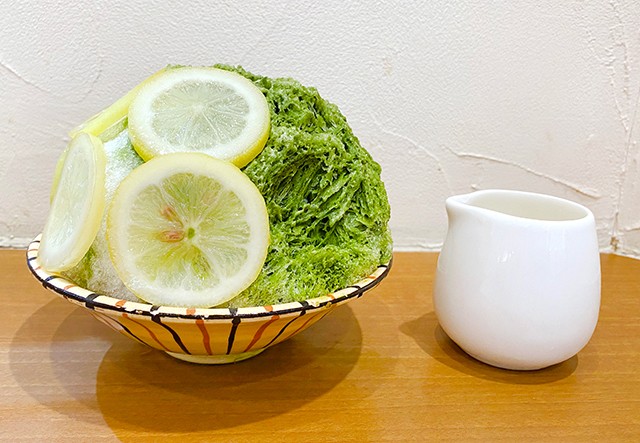 「抹茶レモン氷」は抹茶のほろ苦さとレモンの甘酸っぱさが夏にぴったり。自家製シロップにレモンの輪切りをトッピングして見た目も爽やかです。食べ進めると氷の中から冷たいバニラソフトが!最後まで飽きずに楽しめますよ。