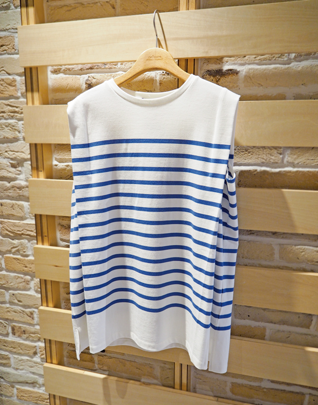 こちらのボーダーシャツも真夏のおでかけにおすすめのアイテム。サラッとしたドライな肌触りがクセになるノースリーブです。ボックスシルエットなので、気になる腕周りもスッキリ見えが叶います。定番のボーダーアイテムは着回し力抜群なので、1着持っておくと◎。