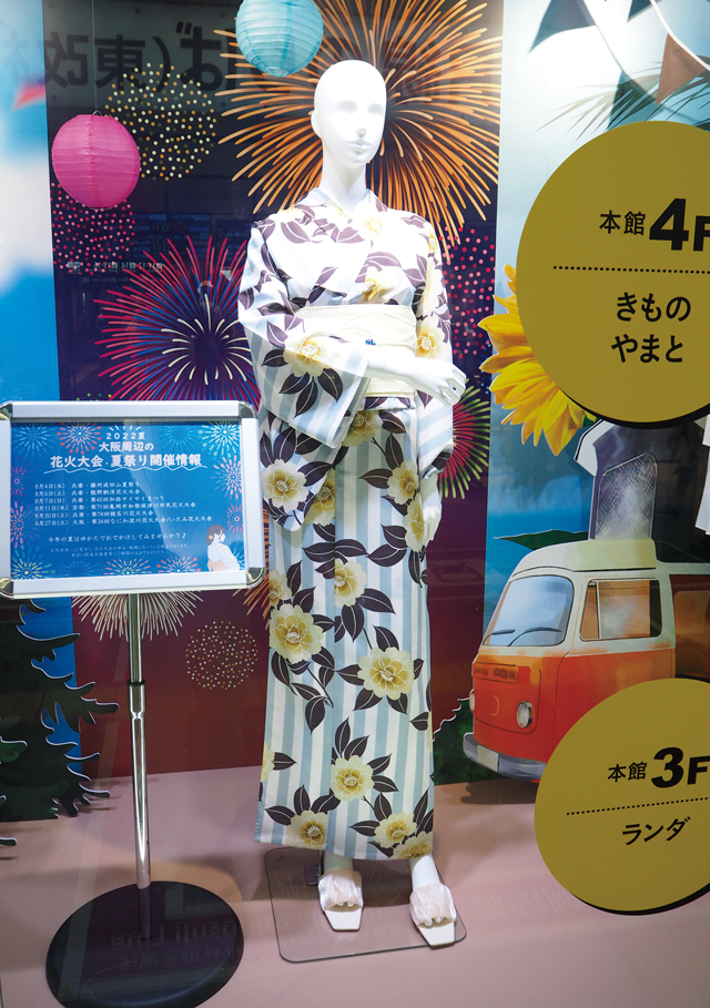 おすすめの浴衣と合わせたコーデをショーウィンドウにて展示していますので、ぜひご覧ください。