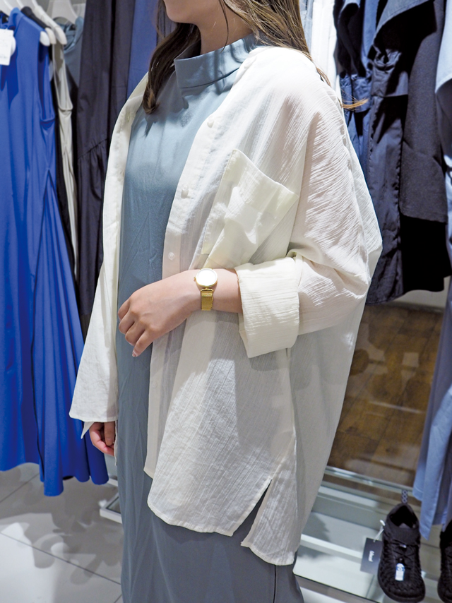 おすすめの着こなしは、上からトレンドのシアーシャツやカーディガンを羽織るスタイル。こちらの、オフホワイトのシアーシャツは楊柳素材の質感が魅力です。夏らしい清涼感たっぷりな爽やかトップスが◎。