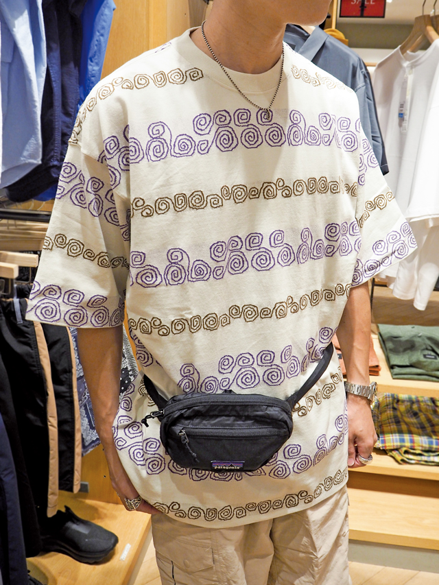 中に着たTシャツは、90年代を思わせるジャガード柄でボーダーを表現したヴィンテージライクな1枚。コンパクトなヒップパックがコーデのアクセントに。どれもメンズアイテムですが、Tシャツとショーツは女性がオーバーサイズに着用しても可愛いので、メンズライクなファッションがお好きな女性にもおすすめです!