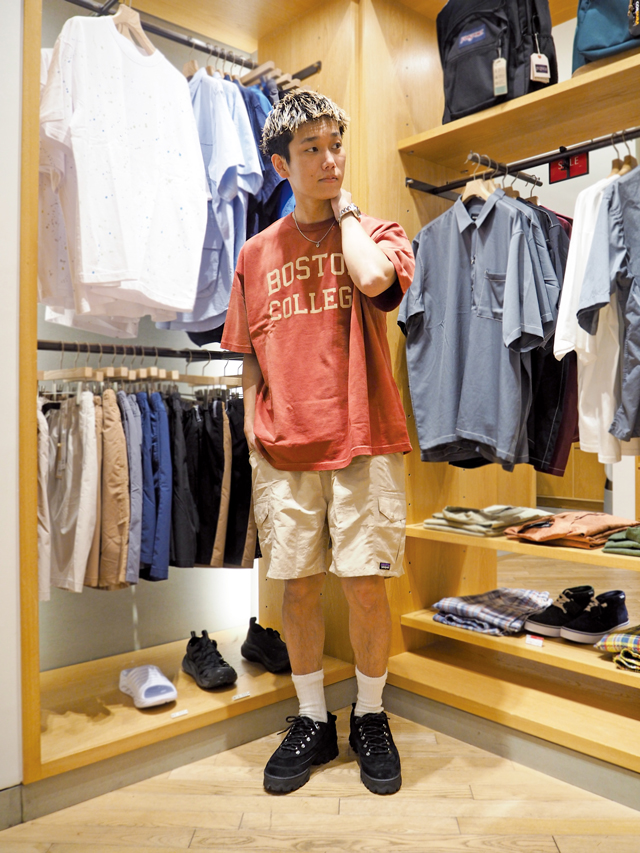 人気アウトドアブランドPatagoniaのショーツを中心とした、機能的なフェススタイル。水中でも着用できる多機能ショーツなら、フェスにつきもののゲリラ豪雨にも対応できます。上に羽織ったロングスリーブシャツは、強い日差しや気温の寒暖差にも安心。こまめにオンオフすれば、野外会場に1日中いても快適に過ごせます。