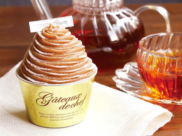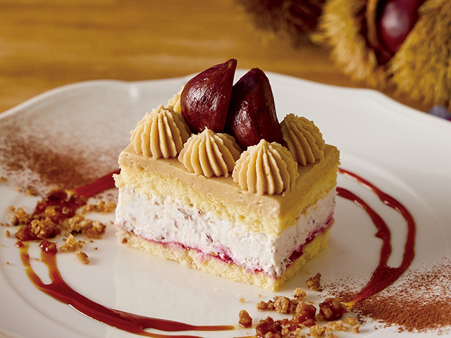 チョコスポンジにディプロマットクリームと栗をサンドした季節限定ショートケーキも登場。イタリア栗のマロンペーストを使ったコクのあるマロンクリームと、優しい甘さのむらさき芋クリームが織りなす色合いも美しい秋の逸品です。