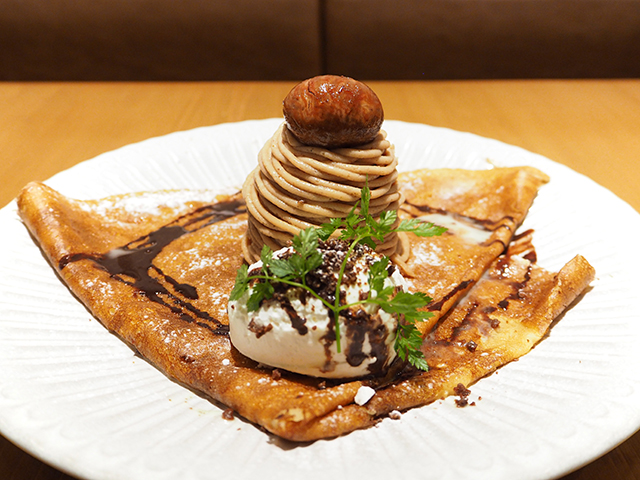 「クレープリーアルション ティーテーブルカフェ」では、フランス産マロンクリームを使った本格モンブランが人気。モンブランクレープは見た目も可愛く食べごたえも大満足な看板メニュー。