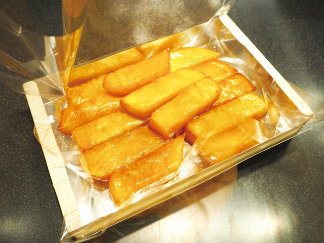 大きめカットで角はカリカリ、中はじゅわっと蜜がしみ出る食感がやみつきに。冷やして食べるのもおすすめです。箱入りのほかパックで購入でき、手土産やおやつにぴったりです。
