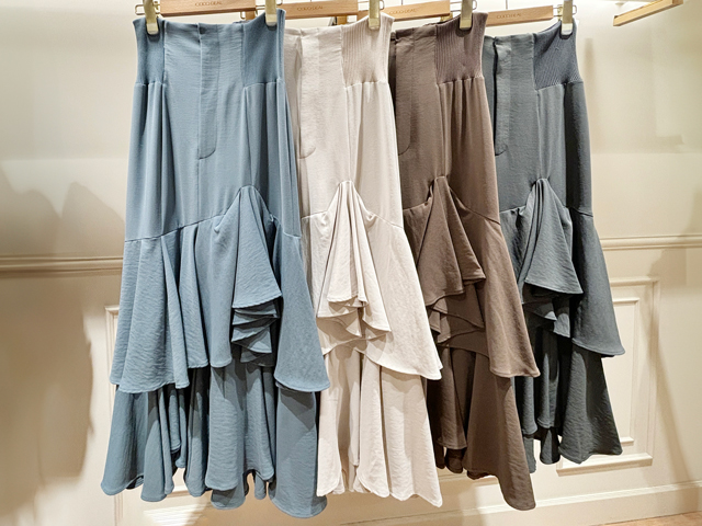 トレンドとベーシックをミックスした、女性のためのデイリーカジュアルブランド「ココディール」から、タックフレアが美しいスカートをピックアップ。アシンメトリーの切り替えや計算しつくされたティアードが、動くたびに女性らしさを底上げします。