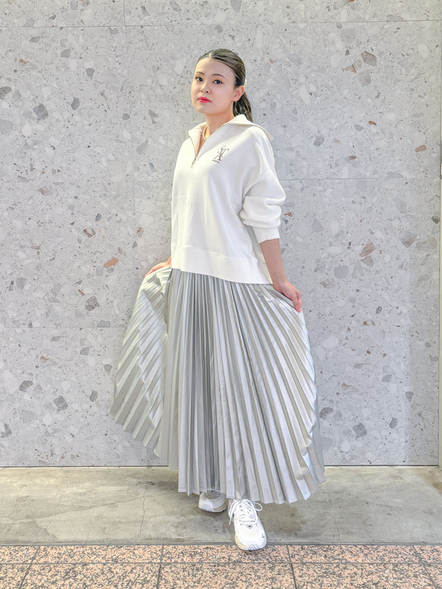 「ウェーブさんは華やかなディテールやカラーが着こなせるので、シルバーのスカートは◎。スウェットもシンプルな中にもワンポイントがあるので、ウェーブさんにぴったりです。」