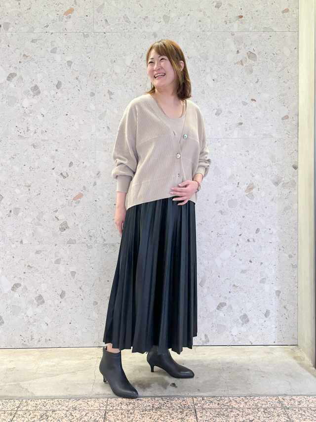 スカート×カーデの王道コーデながら、カーデとタンクトップを同素材にしたりリッチな素材感だったりと、こだわりのディテールで垢抜け感のあるスタイルに。色味はあえて抑えて、美しい素材感を魅せるのが吉。