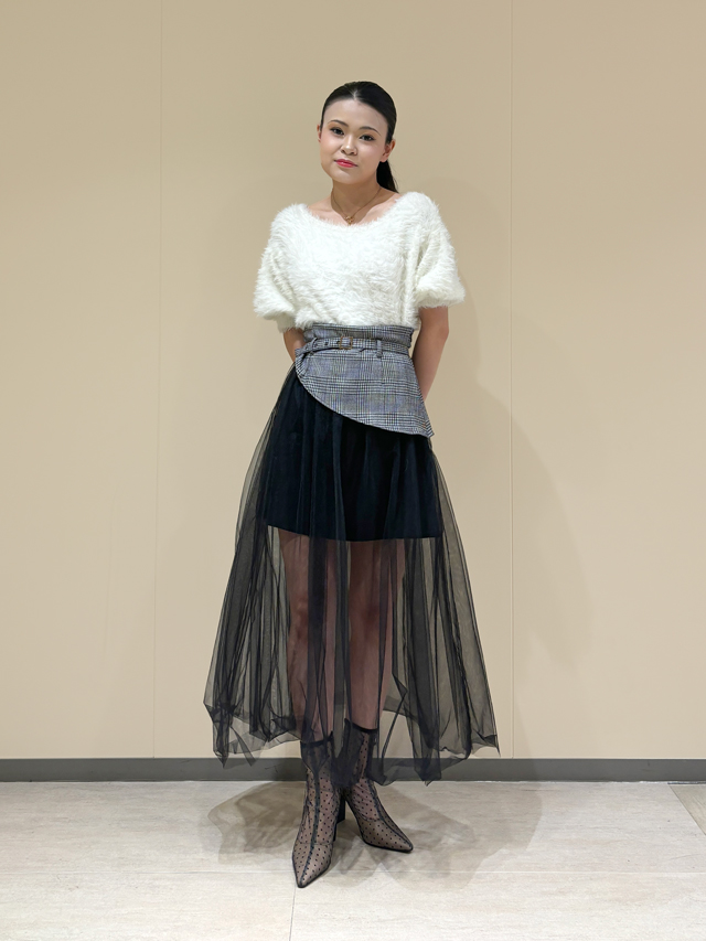 「トップスは写真のように着ても、オフショルで着てもOK。どちらでも上半身がふんわりと印象付けられるので、いろんな着方をぜひ楽しんでもらいたいです。」