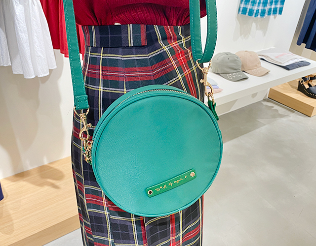 レザーのロゴプレートがさりげなくワンポイントに入ったバッグ。コロンとしたフォルムとカラーが可愛いサークル型ポシェットで小さく見えながらも、内側には小さなポケットがついた収納力もあるアイテム。ショルダーストラップを外しても使用できるので、様々なシーンで活躍できるバッグです。
