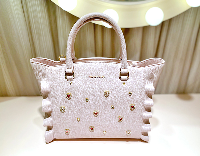 サマンサべガで人気のフラッターシリーズ。ビジュー部分がハート型になっていて、可愛いデザインがポイント。特別感のあるキラメキをプラスした、持っているとテンションが上がる女の子らしいバッグです。
