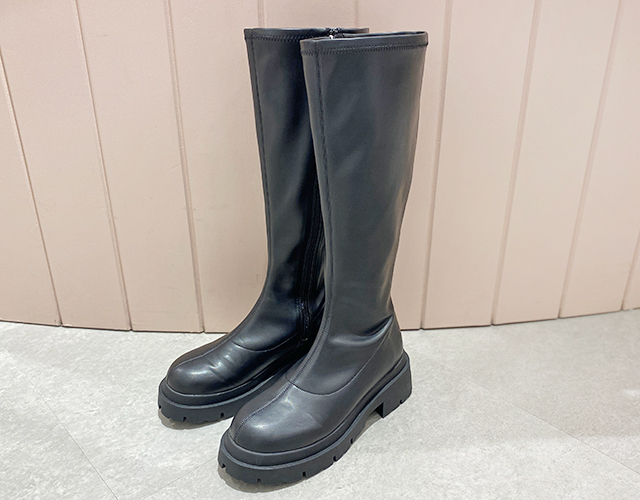 トレンド感のあるロングブーツは今シーズンも人気のアイテム。厚底(5cm)+インヒール(1cm)で美脚見えとスタイルアップが叶うところも嬉しいポイント。撥水加工と抗菌防臭加工が施された優秀アイテムで、履き心地の良いストレッチが効いた柔らかなフェイクレザーも魅力的なポイントです。