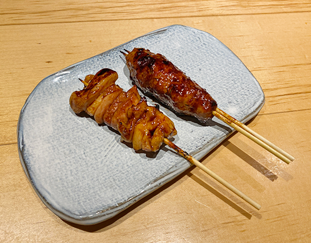 独自の掛け合わせにより開発した「地鶏 丹波黒どり」。繊維質の多い自家製配合飼料のを与え、健康な鳥を育てています。肉質はきめ細かく、鶏肉の臭みはなく、ほどよい歯ごたえとコクのあるおいしさです。焼き鳥の「炭火焼串盛り合わせ(5串) 1,100円(税込)」は、通常メニューでランチでもディナーでも注文できます。
