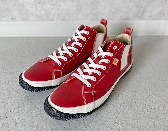 レッドカラーが可愛いシューズ。カンガルーレザーを使用しており、横についているサイドゴアが機能することにより、着脱が楽に。レディース、メンズのどちらもサイズもご用意しております。