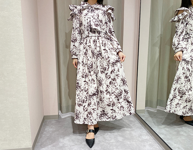 ブラウンの大きな花柄が大人かわいいワンピース。肩の程よいちら見せがコーデのワンポイントに!アウターコーデにもぴったりなアイテムで秋冬にもおすすめなアイテムです◎