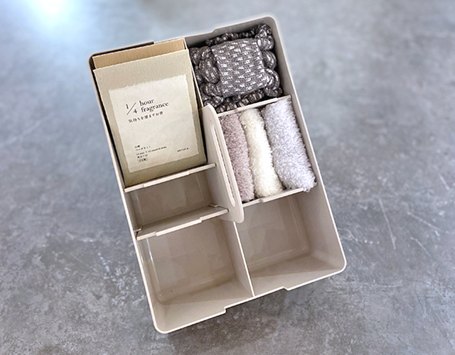 小物をまとめて収納し、まるごと持ち運べる収納アイテム。仕切り板が移動でき、収納物のサイズに合わせてセットできる仕切板4枚付きなところもおすすめポイント。ステーショナリーを入れてデスクワークのお供に、リビングやキッチンの収納、救急箱、鏡を立てかければ化粧道具を入れてコスメボックスにもなり、家中、いろんな用途に使えます。タブレット・スマートフォンを立てかけられるからテレワークなどにも便利なアイテムです。