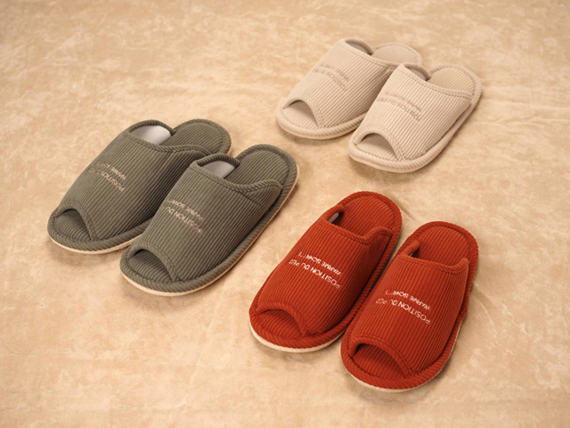 コーデュロイ素材の温かみが魅力のスリッパ。ワンポイントのロゴデザインがさりげなくおしゃれです。足元を温めてくれるので、寒い季節のおうち時間が快適に。