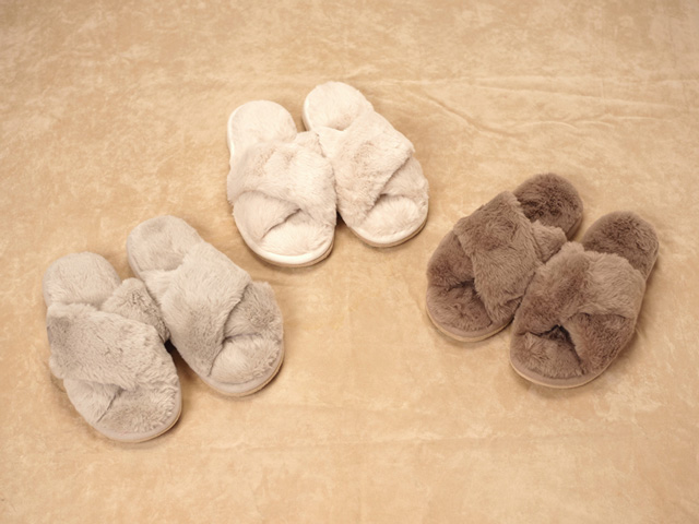 ふわふわのファー素材で包み込まれるような履き心地のスリッパ。足元をクロスに留めるデザインがアクセントになっています。3つのカラーバリエーションがあり、揃えると統一感が出ておしゃれな雰囲気にまとまります。
