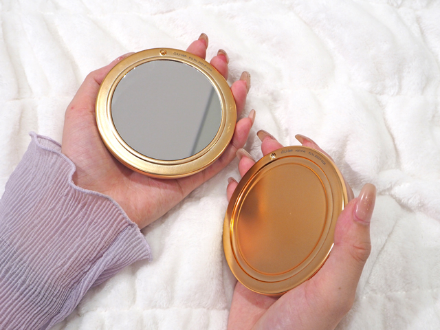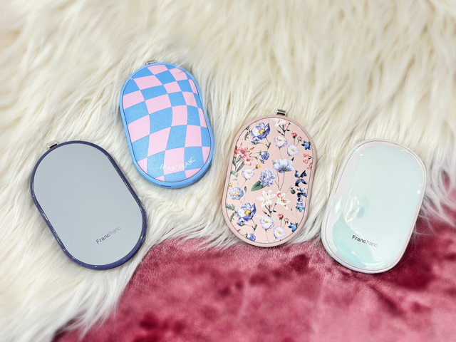 温度は強弱2段階で切り替え可能。ダブルクリックで電源ONになる設計で、バッグ内での誤作動を防ぎます。2つに分けた片側にミラーが付いているので、外出先での身だしなみチェックにも便利です。巾着型の収納袋付き!