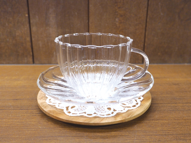 おしゃれなガラス製のカップ&ソーサーで、飲み物の色合いまでじっくり楽しむティータイムを。耐熱仕様なのでホットドリンクにも安心して使えます。レースのコースターを組み合わせればおうちカフェセットに♪