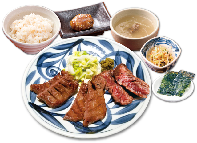 ジューシーで歯応えも魅力の厚切り牛タンを炭火焼きで提供する「牛たんと和牛焼き 青葉苑」からは、「いい肉の日」にちなんで特製セットがお目見え!お店オリジナルの味噌味・塩味の牛タン2種類に加え、やわらかな食感の牛ステーキ、うまみたっぷりの牛タンつくねだんごと、多彩なお肉が1つのセットで存分に堪能できます。加えて、白菜の浅漬け、もやしナムル、牛テールスープ、韓国のり、麦ご飯も付いて大充実。プラス110円でとろろも付けられるので、ぜひ追加してとろろご飯&牛タンのとっておきの組み合わせを楽しんでください!