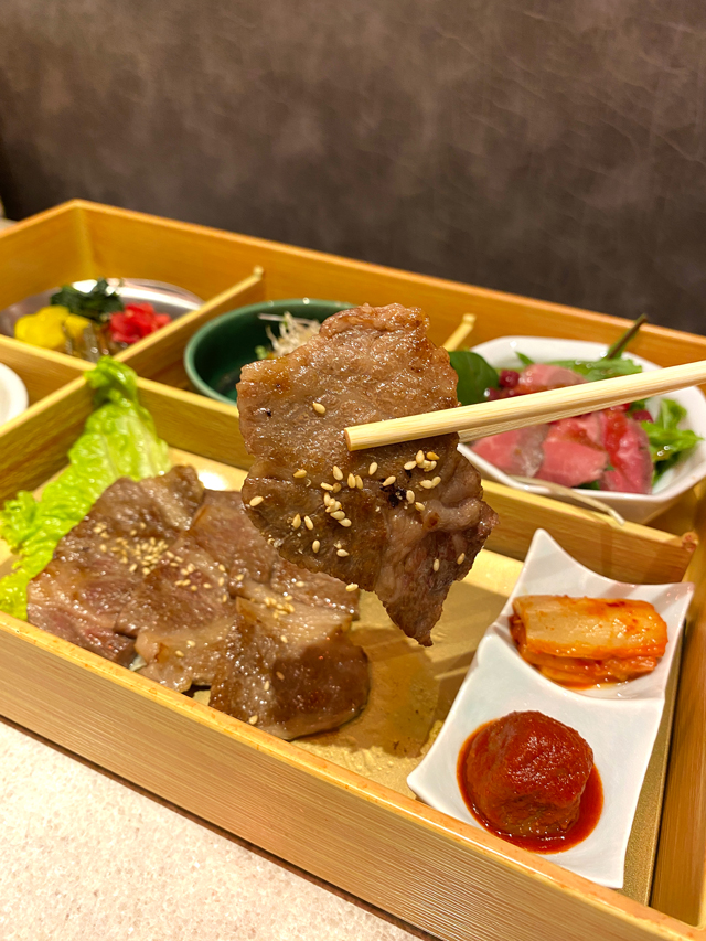 メインとなるのは黒毛和牛ロースの焼肉で、やわらかな赤身とすっきりとした脂のバランスが絶妙。添えられたキムチやコチュジャンとともにいただけば、後口もさっぱりです。