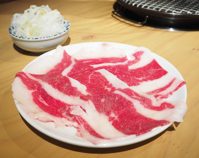 さて、まずは前バラの一部分「コウネ」からいってみましょー♪極薄カットですぐに火が通るので、焼きしゃぶ感覚でさっと加熱し、セットのオニオンスライスとともにぱくり。わわわ、脂身のコクと赤身のうまみ、オニオンスライスの新鮮なシャキシャキ感が絡み合って抜群においしいです〜泣