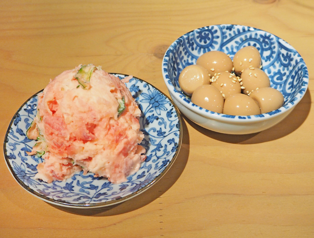 「大松」では、焼肉メニューだけでなく、ちょっとつまめる居酒屋メニューが充実しているのも高ポイント。あるとうれしい、彩り鮮やかな「ポテトサラダ」は福神漬入りで甘めの味がGOOD。さらにお酒のアテにぴったりな「うずら醤油漬け」も。またお酒が進んでしまいました・・・!