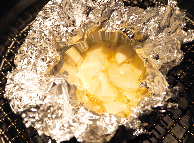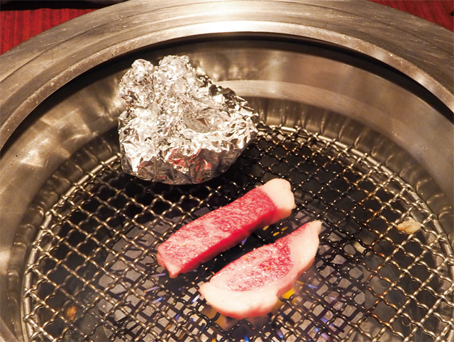 ニンニクは焦げやすいので網の端で蒸し焼きにしておいて、その間にお肉を焼いていきます。網なので余分な脂がほどよく落ちていい感じに焼き上がっていきます。わくわく。