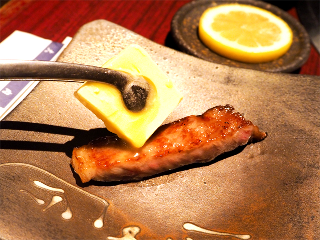 まずはお肉そのもののうまみを味わうべく、バターをお肉の表面になでつけてぱくり……!極上のおいしさです!!脂ののったジューシーなお肉と、バターの香ばしさがしっかり絡み合い、なんとも不思議で絶妙な味わいで、新たな美味しさを発見しました。