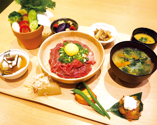 これに日替わりのおばんざい複数種類と野菜たっぷりお味噌汁、鉢植えサラダをセットにした、ハレの日にもぴったりな豪華ランチ。テーブルに届いた瞬間笑顔になる、おしゃれなルックスにも注目!