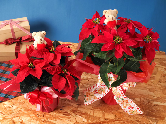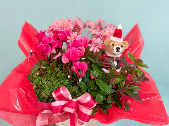 季節のお花をぎゅっと詰めたバスケット。シクラメンやポインセチアなど冬の花々と観葉植物を組み合わせ、ぬいぐるみのピックを添えたキュートなセットです。天王寺駅・阿倍野駅から立ち寄りやすいお店なので、移動中でも気軽に立ち寄れます。