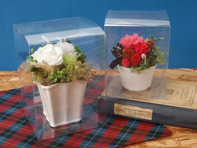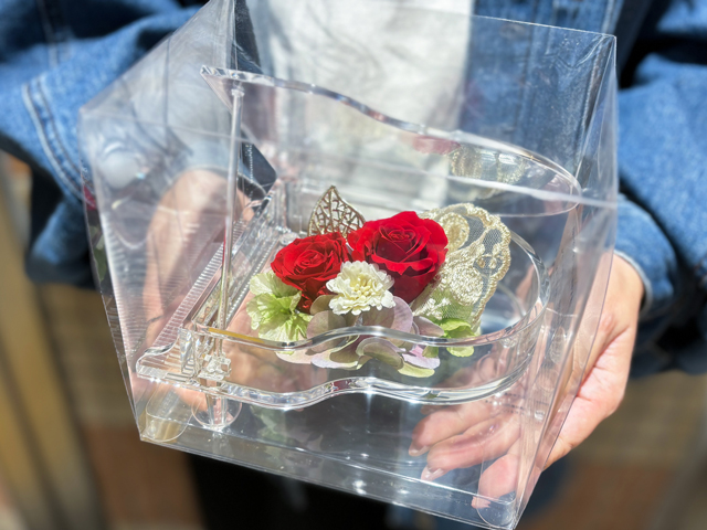 プリザーブドフラワーやリースなどフラワーギフトが豊富な「グリーンショップ とみもと」。特殊加工で長く楽しめるプリザーブドフラワーは、鮮やかな色合いと華やかさが魅力。写真のほかにも多くのカラーバリエーションがあり、イメージに合わせて選べます。