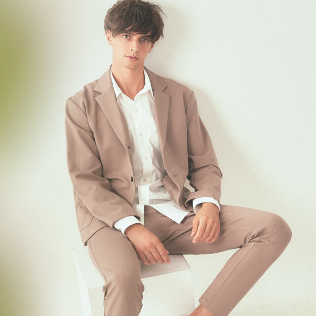 カジュアルすぎない柔らかなニュアンスカラー。ジャケット&ボトム、いずれも360度伸縮する快適素材「4wayストレッチ」を採用しているのでストレスフリーな着心地です。今っぽいゆとりのあるシルエットなのに、ボトムがルーズすぎないので上品な印象に。オーバーサイズのスウェットやニットとコーデしてもキレイに着こなせます。インナーを変えるだけでガラッと印象が変わるのも特徴。シャツを合わせて大人っぽく、ボーダーなど遊び心のあるロンTとの組み合わせやワントーンコーデもおすすめ。