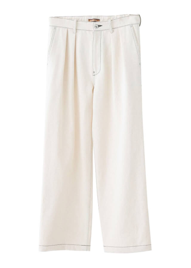 あえて洗いをかけていない、クリーンなホワイトデニム。前側にタックをとり、ヒップ周りにゆとりをもたせたワイドストレートシルエットで、トレンチコートやロング丈の羽織のコーデにぴったり。着こなしやすいカラーなので、ワイドパンツに挑戦したことがない人でも安心。岡山で作られた高級デニムを使用した、しなやかでしっかりとした生地感も魅力。秋だけじゃなく、1年中楽しめるデニムです。