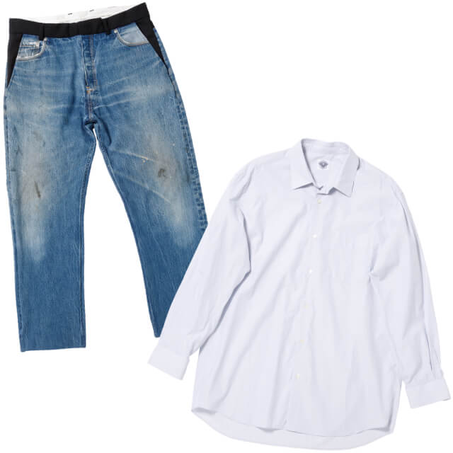 創業143年のオーダーシャツ専業店「大和屋シャツ」に別注した特別なシャツ。袖を通すと生地がしなやかに身体を包み込む、まるで工芸品のような美しい仕上がりです。シルエットは、光沢のあるドレス生地を使用した、ゆとりのあるオーバーサイズシルエット。ボタンには上品な輝きの白蝶貝を使用し、穴の間隔や付け方にまでこだわることで、より繊細でモードな仕上がりに。厳選された古着を解体し再構築したリビルドデニムは、美しいシルエットでドレスシャツとの相性も◎。どちらもブランド30周年の特別な別注アイテムです。