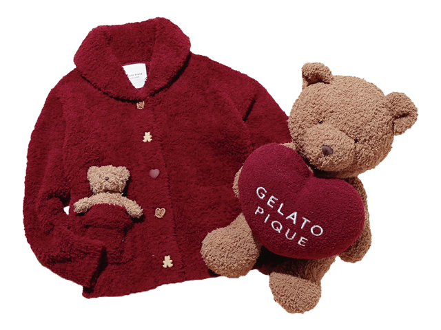 「GELATO PIQUE HOLIDAY COLLECTION」から2つのアイテムをご紹介。1つ目はミニサイズのベアがセットになった、ホリデームード漂うもこもこニット。ジェラート生地を使用したゆったり羽織りやすいデザインです。ベアやハート、プレッツェルの形をしたボタンが、ホリデーシーズンの幸せな気分を盛り上げます。