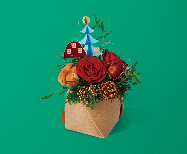 バラやヒムロスギ、アロマが香るコニファーなど、五感に訴える素材を使ったアレンジメント。ハウスとツリーのオーナメントがついた、雪深い北欧のクリスマスを思わせるクリスマス限定のデザインです。花瓶いらずで、気軽に飾れる点もポイント!バラの花言葉「愛」に気持ちを託しましょう。