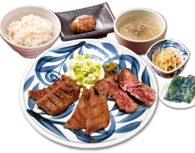 お店オリジナルの味噌味・塩味の牛タン2種類に加え、やわらかな食感の牛ステーキ、うまみたっぷりの牛タンつくねだんごと、多彩なお肉が1つのセットで存分に堪能できる贅沢なセットです。