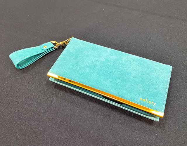 スエード調の大人っぽさの中に、ゴールドの輝きが上品。外側にはカードポケット、内側にオーバルミラーが付いており、仕事でもプライベートでも使いやすいスマホケースです。