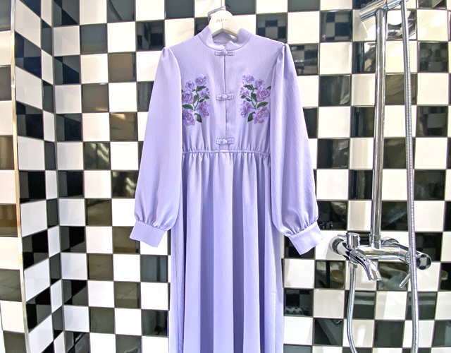 フラワー刺繍を施したワンピース。チャイナ風の他にはないデザインで周りと差がつきます。ウエスト位置が高いので足長効果も◎